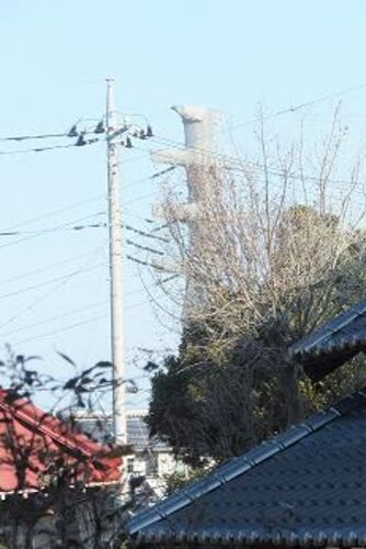 原付を走らせていて我が家に近づいた時に目に入ってきたもの。 西の方向と、東の方向に二つの建物。 よーく見たら鉄塔? カバーを全体にかけてあるもんだから威圧感ある。 まるで怪獣がにらみ合っているような。 あれは送電線? 以前からあったもの? それと…