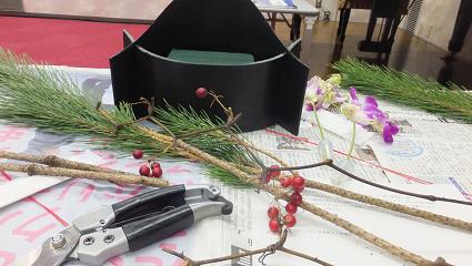 レースフラワーにサンキライの赤い実とスプレー菊。