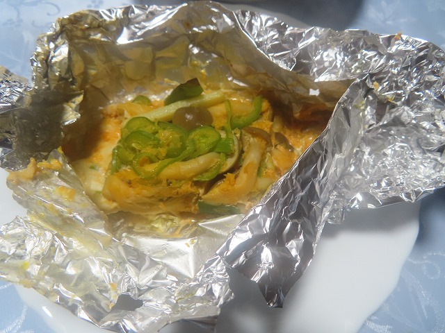 しかし、実際にはもっと簡単に焼けるように(^▽^;)包みを程して(^▽^;)耐熱ガラスに移し、さらにおろし人参を乗せてオーブントースターで25分焼きました。
